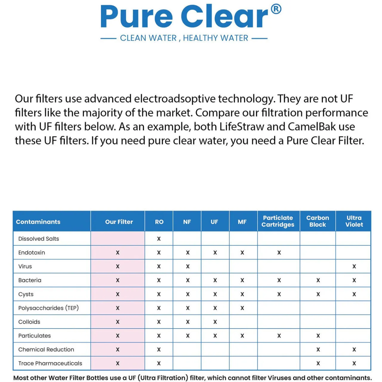 - The Pure Clear® Collapsible Squeeze Water Filter Bottle protects against waterborne viruses, bacteria, parasites, endotoxins, microplastics, chlorine, trace pharmaceuticals, chemical reductions (PFOA’s), organic and chemical matter, dirt, sand, cloudiness and improves taste.