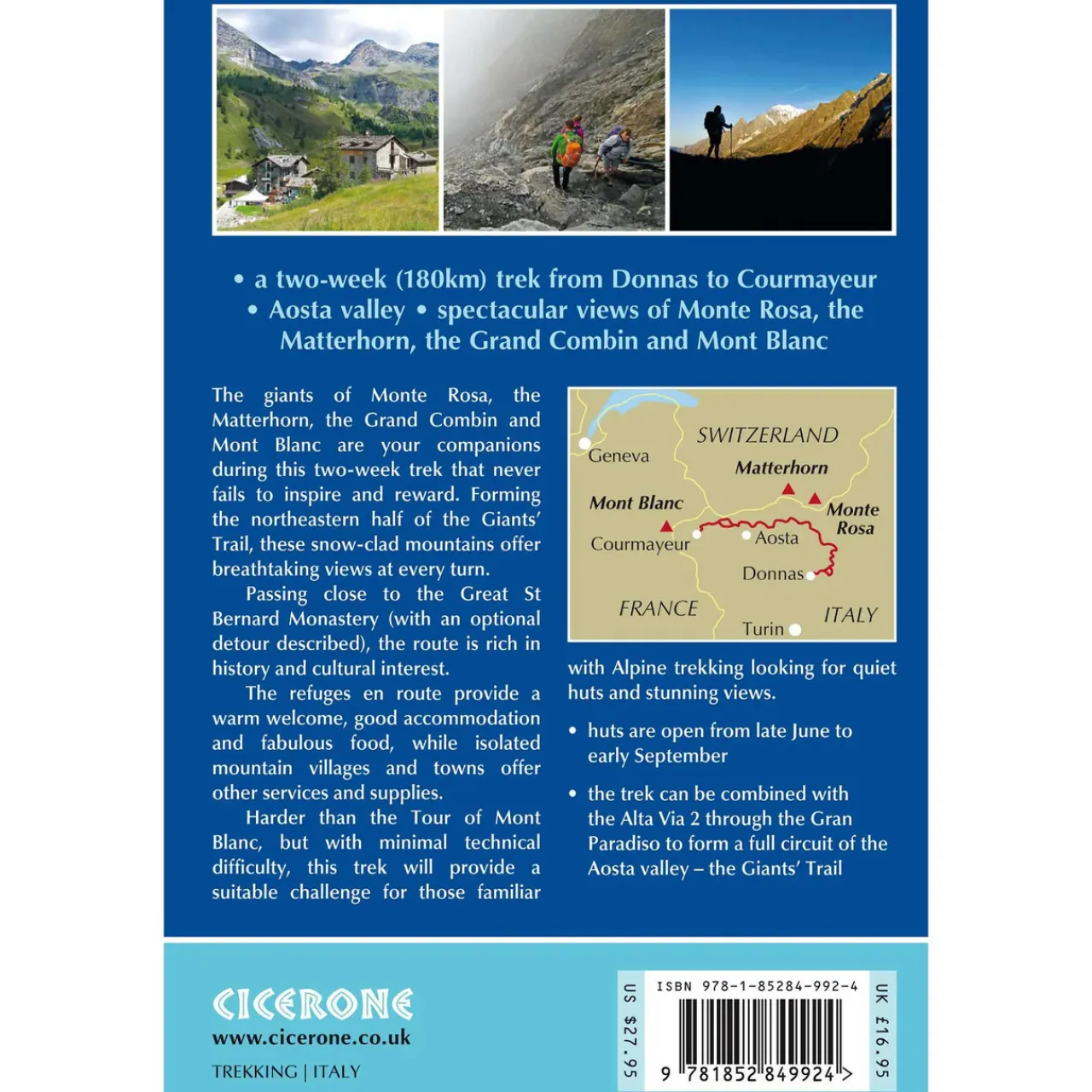 Italy’s Alta Via 1, a 180km trail through the Italian Alps following the northern flank of the Aosta Valley, boasts magnificent views of the Alpine giants: Mont Blanc, the Matterhorn, the Grand Combin and Monte Rosa. Indeed, it is sometimes known as the Giants’ Trail and can be combined with a sister-route, the Alta Via 2 (covered in a separate Cicerone guide), which runs along the southern flank of the valley, to form the Tor des Géants. Stretching from Donnas to Courmayeur, the Alta Via 1 offers fantastic alpine walking, with welcoming refuges and small hotels providing overnight accommodation (and great food) along the way.