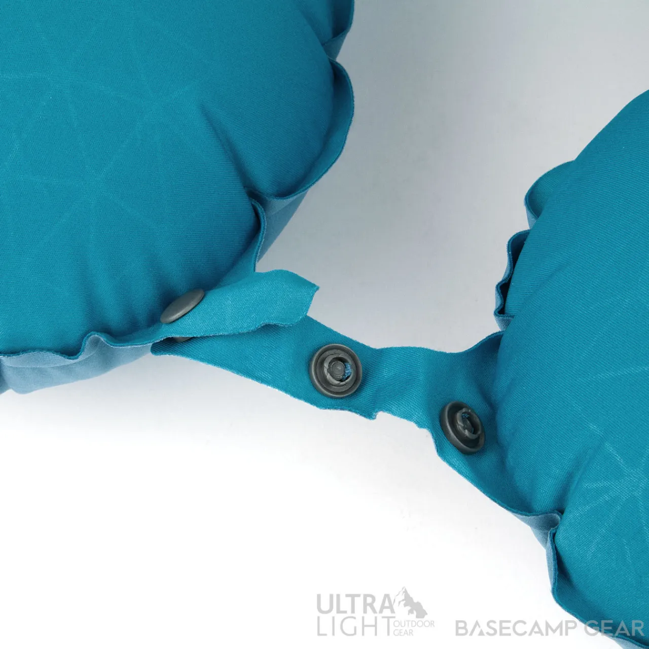 The Aeros Ultralight Traveller Pillow includes an adjustable neck closure to support the entire circumference of your neck, providing a more comfrotable sleep. The closure is made from welded 20D knit fabric which offers stretch and softenss without requiring bulky edge binding. Three press studs are applied to he fabric offering two lengths to choose from. The Aeros Ultralight Traveller Pillow closure runs directly from the perimeter weld.