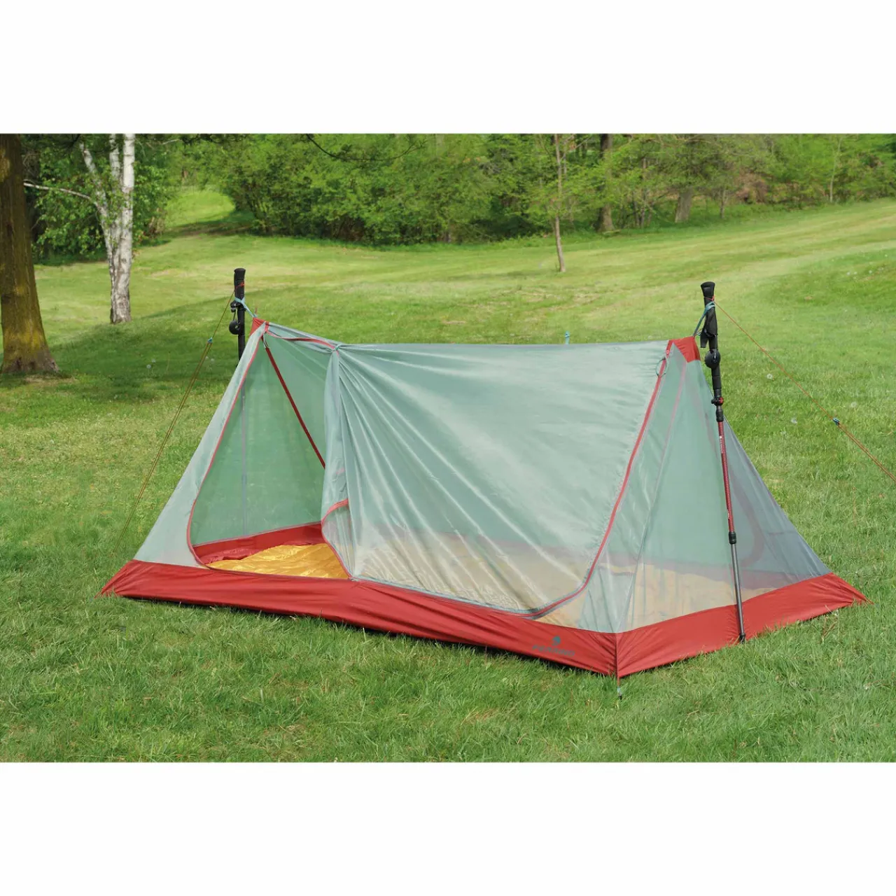 The Ferrino Den 2 weighs in at just over 1.1 kg and utilises trekking poles instead of standard tent poles, making it a smart solution for those already carrying poles and seeking to reduce pack weight. It’s a-fram design provides a low profile, with good stability and ventilation thanks to twin end vents and mesh door panels. Setup is quick, though careful guying is needed for maximum stability.
