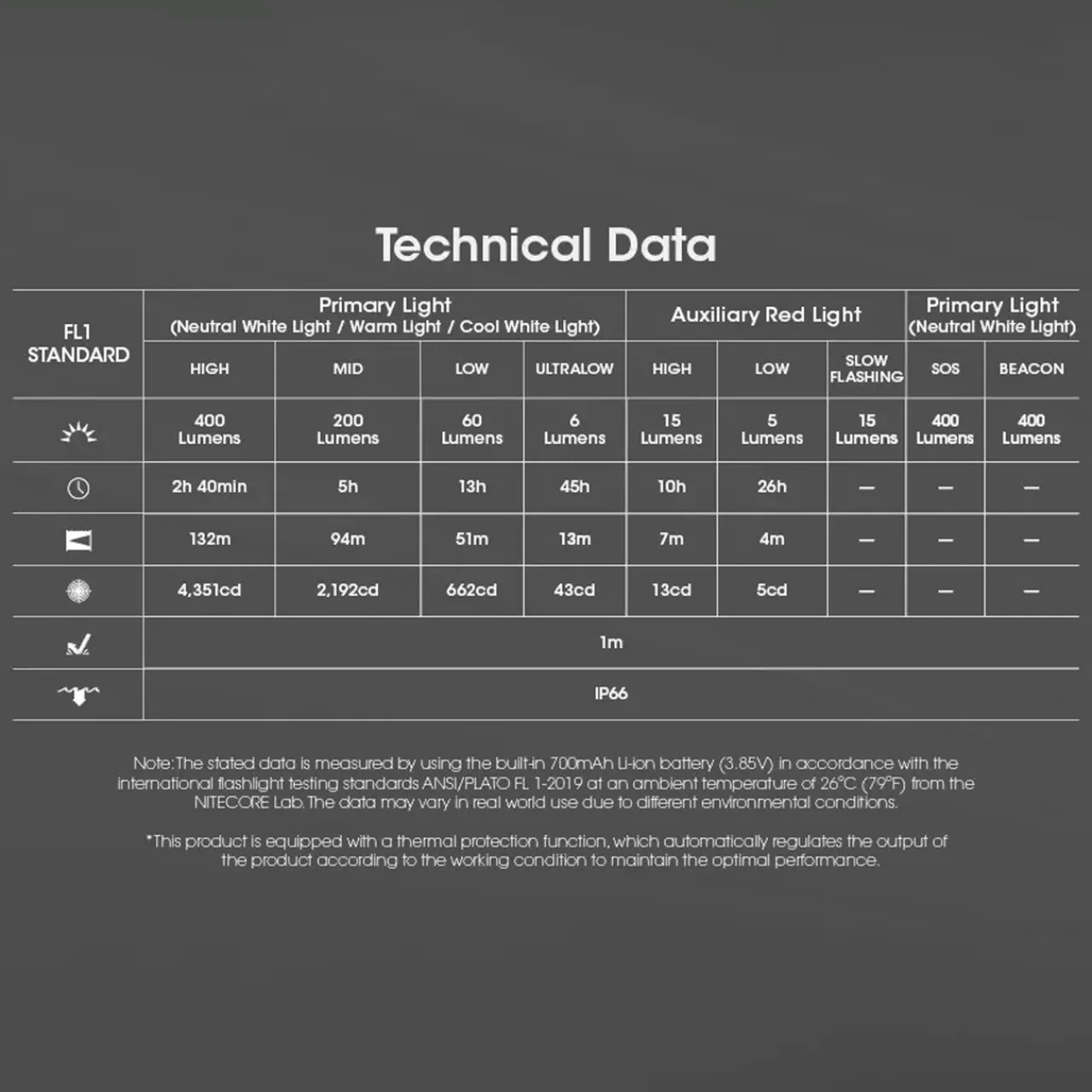 - Low: 5 lumens- 26hr runtime
