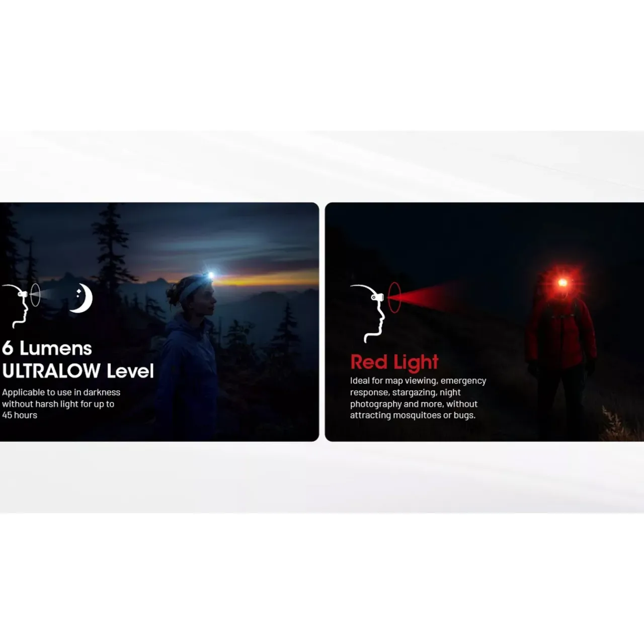 The headlamp comes with dual primary lights both with three colour temperatures: 3000K warm white, 4500K neutral white light and 6500K cool white light. This makes the headtorch perfect for all outdoor activities such as, night runs, hikes, camping and so much more.