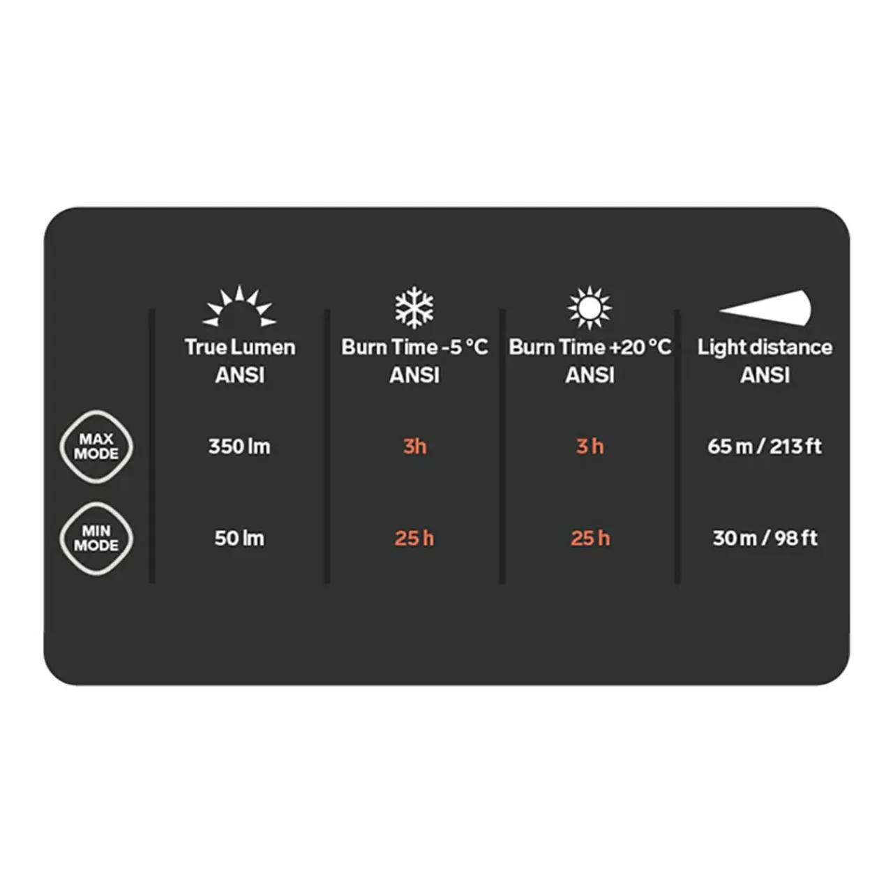 - Max Mode: 350 lumens / 65 metres, 213 ft / 3 hours (-5C), 3 hours (+20C) Burn time