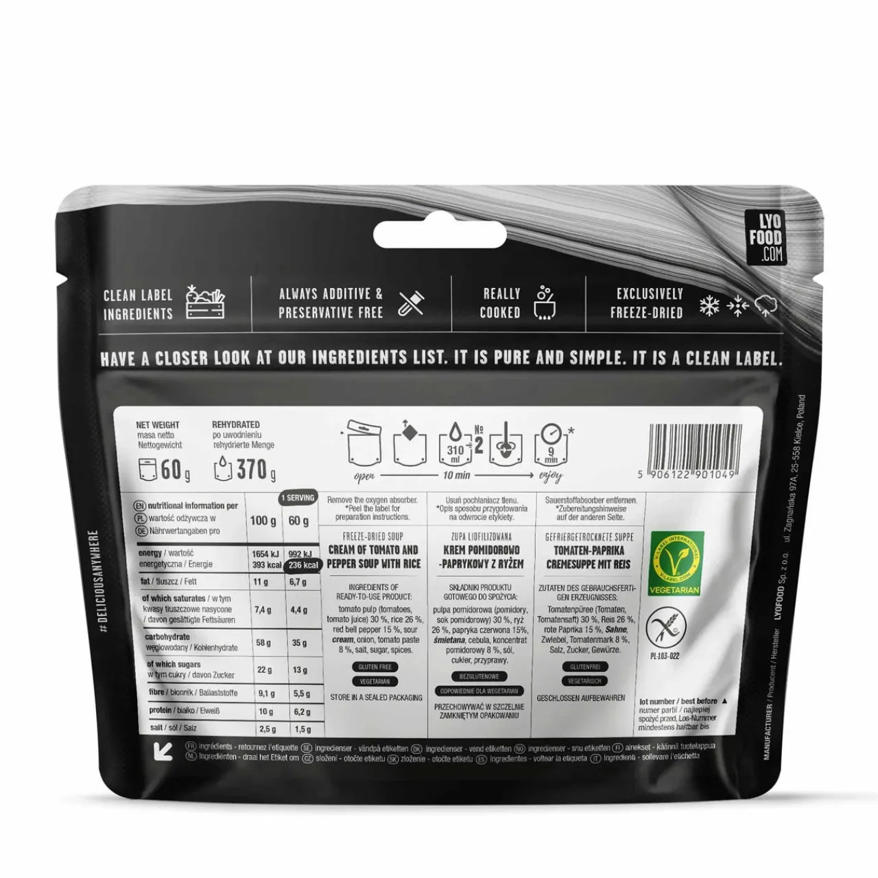 - tomato pulp (tomatoes, tomato juice) 30 %, rice 26 %, red bell pepper 15 %, sour cream, onion, tomato paste 8 %, salt, sugar, spices