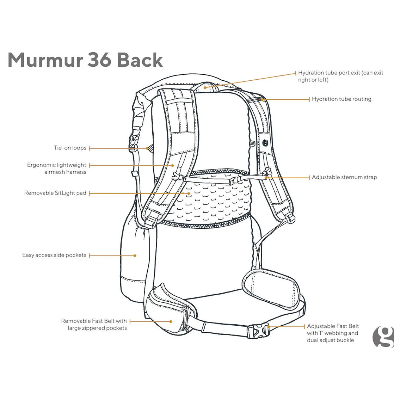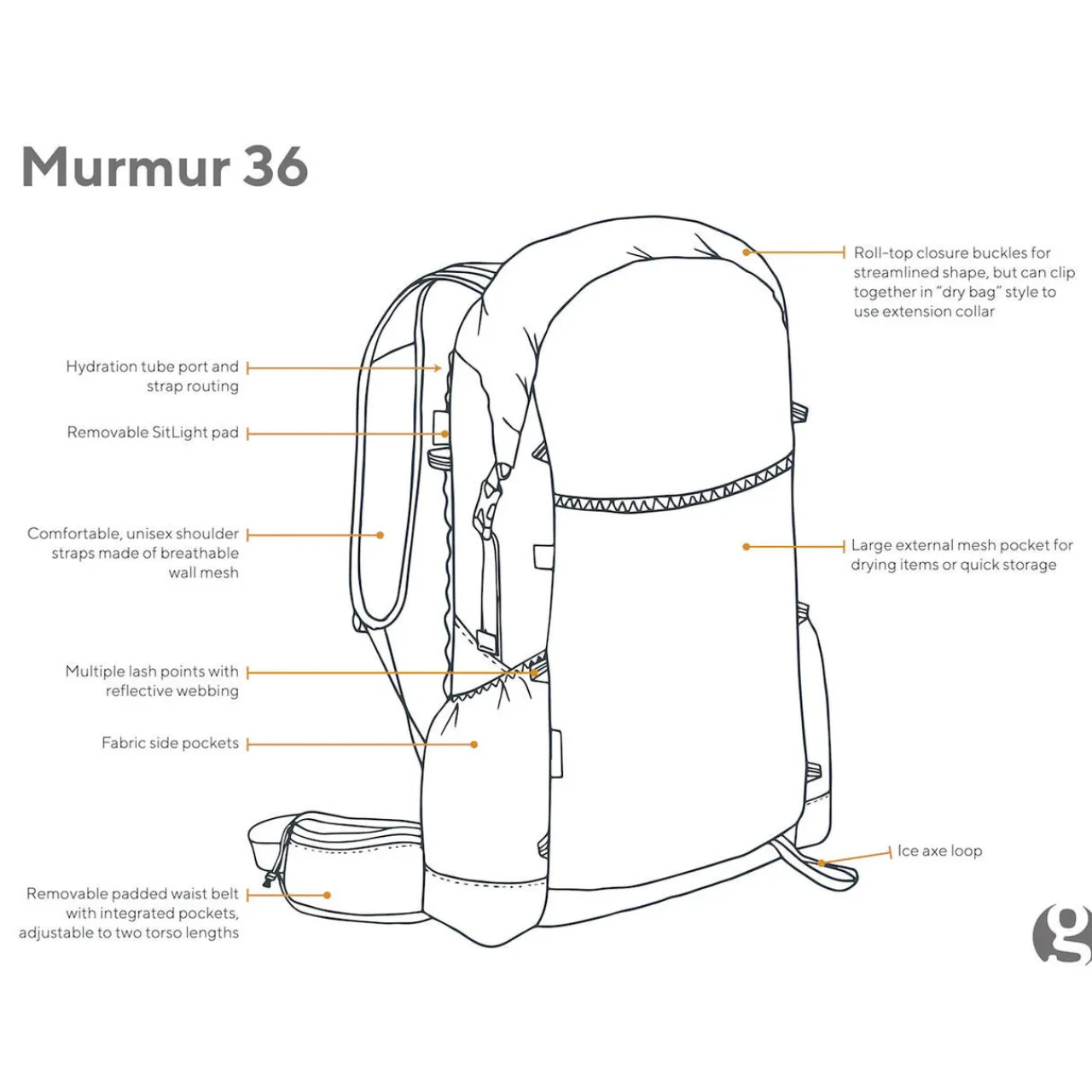 Equipped with a range of features to enhance comfort and convenience on the trail, the Murmur 36 boasts a roll-top closure system, a removable padded waist belt with integrated pockets, and unisex shoulder straps constructed from highly breathable mesh. The pack also includes removable Velcro loops for securing items, a large mesh pocket for quick storage, and stretchy back panels for holding a sit or sleeping pad. With a weight of just 356g and a maximum carry capacity of 9kg, the Murmur 36 is the perfect companion for ultralight backpackers looking to tackle challenging adventures easily.