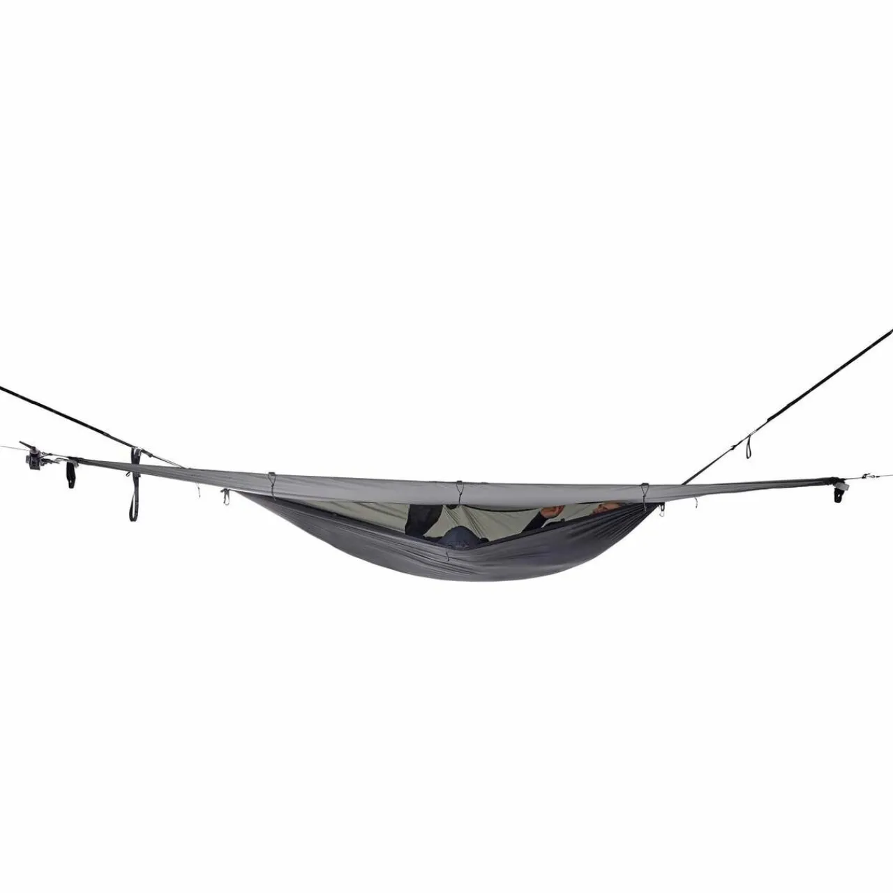 The two enclosed hammock slings make setup quick and easy and with the included carabiners you have everything you need for a myriad of different setups. Apart from the newly added accessories, major updates to the Voss Tech include an integrated poncho hood, that doubles as a hammock sidepocket when stoved away and an ingenious hammock conversion system, where you simply pull the corner webbings to form a perfectly balanced hammock. And then you simply fold over the other part of the tarp to create a roof, large enough to cover and protect you from the elements while you rest. Extra pull slings for a great double layer hammock are also included.