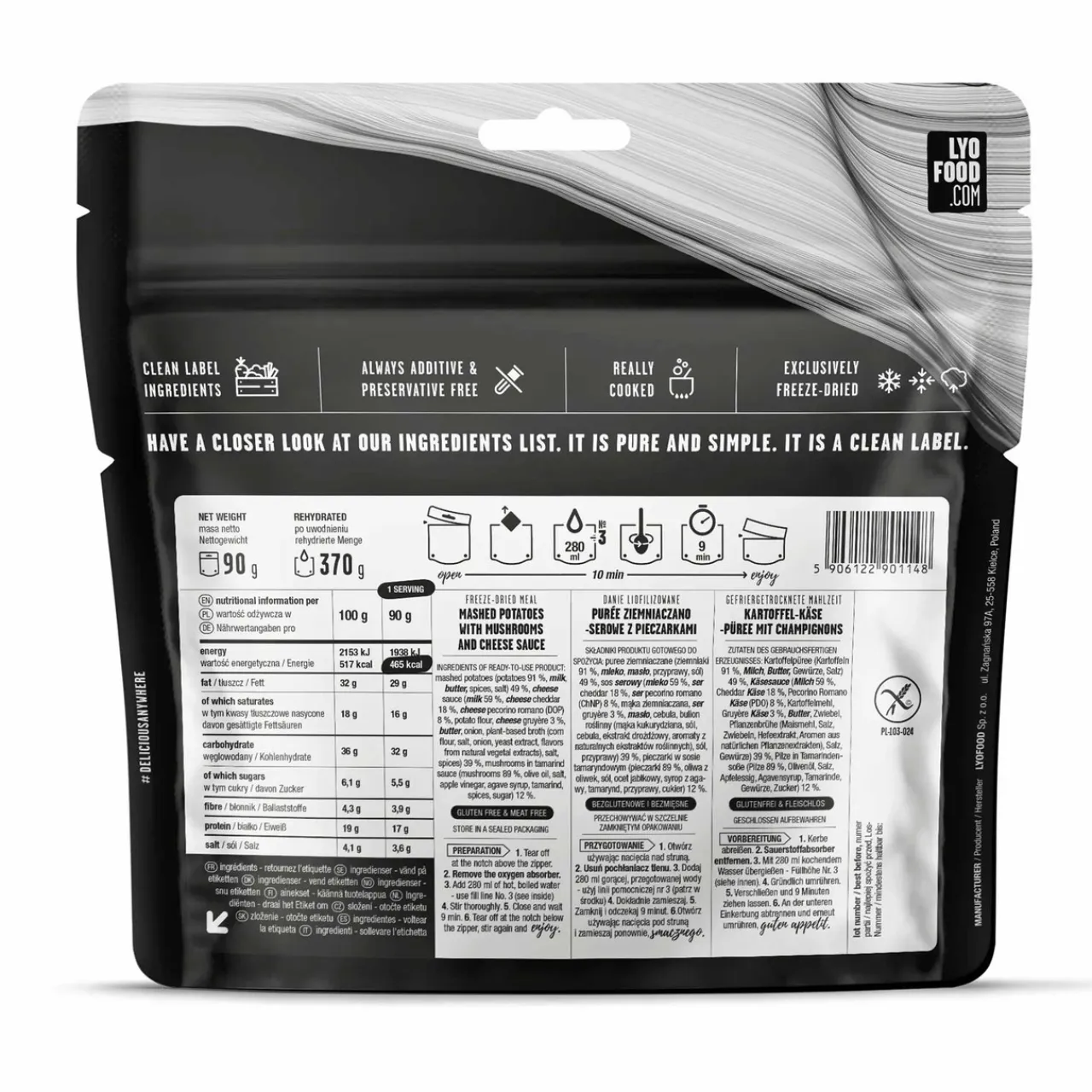 - mashed potatoes (potatoes 91 %, milk, butter, spices, salt) 49 %, cheese sauce (milk 59 %, cheese cheddar 18 %, cheese pecorino romano (DOP) 8 %, potato flour, cheese gruyère 3 %, butter, onion, plant-based broth (corn flour, salt, onion, yeast extract, flavors from natural vegetal extracts), salt, spices) 39 %, mushrooms in tamarind sauce (mushrooms 89 %, olive oil, salt, apple vinegar, agave syrup, tamarind, spices, sugar) 12 %.