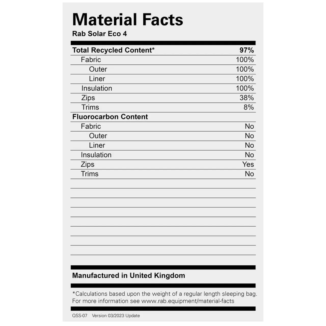 Rab’s Solar Eco 4 Synthetic sleeping bag fits into Rab’s Solar Eco range which combine recycled synthetic materials and cutting-edge technology to produce performance bags that are also eco-friendly, although the Solar Eco bags are a bit roomier and therefore with a slightly lower warmth to weight ratio than Rab’s other synthetic range – the Solar Ultras.
