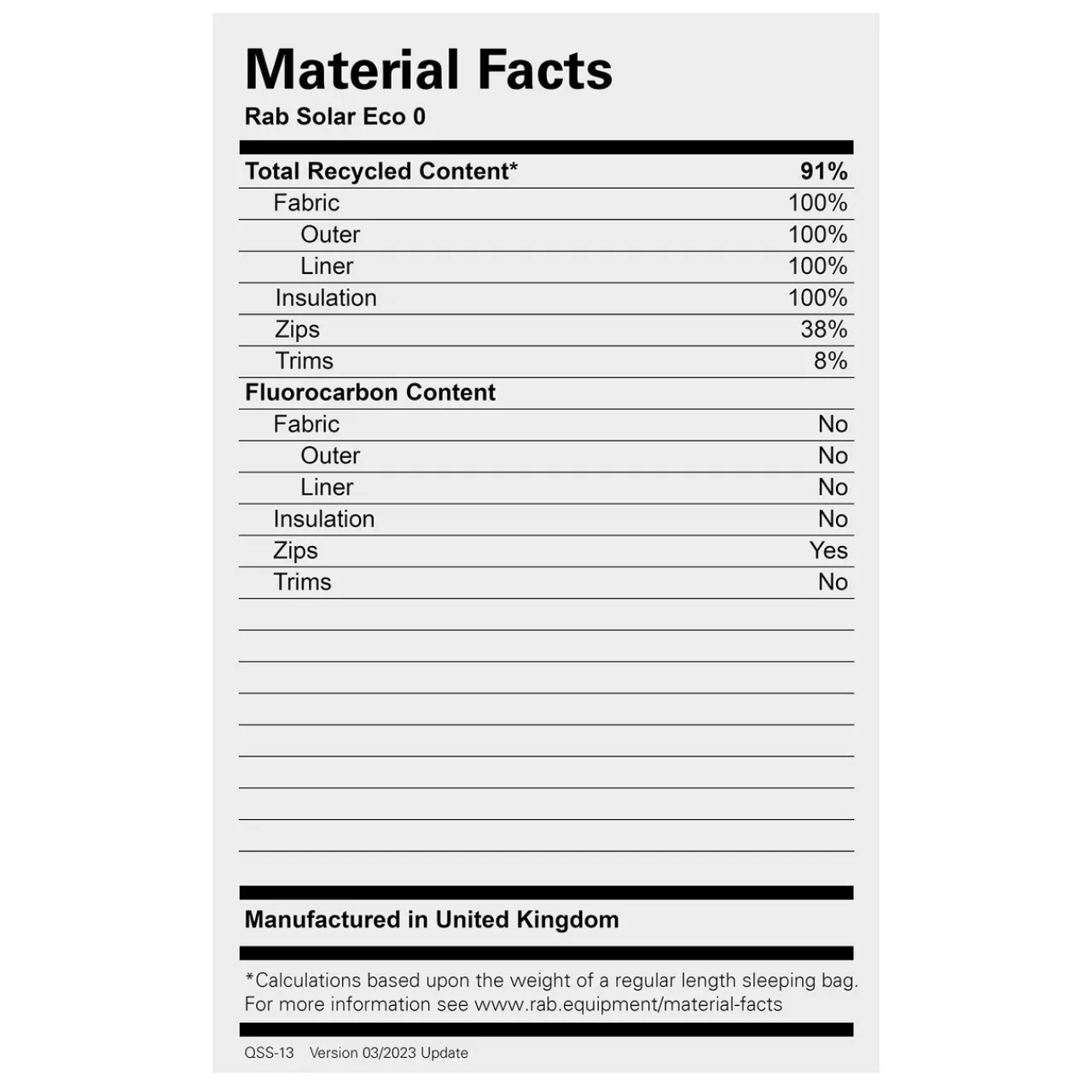 Have Rab achieved their goal? – well a leading edge down bag with an EN Comfort rating of 0C will typically weigh between 550 and 600grams, the Solar Eco 2 weighs 980grams and has a slightly better rating of -1C, so there is a significant weight premium for the synthetic version.