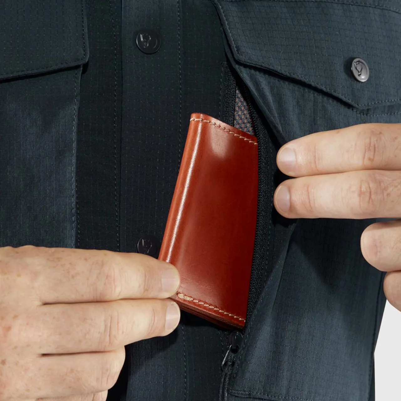 Short-sleeved Abisko Trekking Shirt will keep you comfortably cool even on really hot days on the trail. Made from a lightweight, technical fabric that wicks away moisture and lets in air at the same time as it feels cool against the skin. Double chest pockets with flaps that can be both loaded from the top or from the sides with vertical zippers and mesh lining – the latter can also be used as ventilation openings. Perfect for trekking and travelling, and can be packed into one of its own chest pockets.