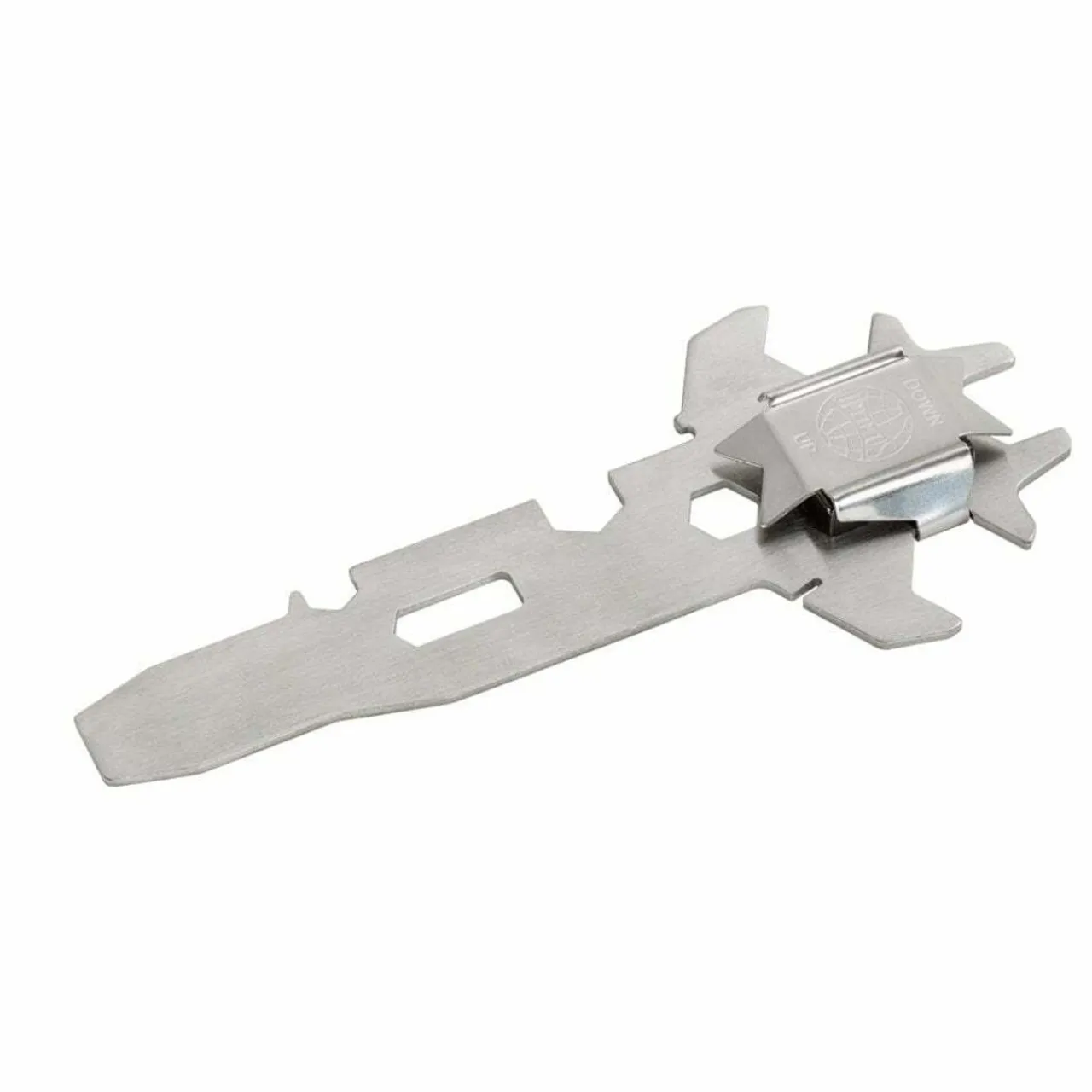 Multitool for Optimus Nova and Nova+. Service functions: 11 mm key forburner bottom nut, 10 mm key for fuel hose change, hook for pump valve, 7 mm key for pump leather cup, 8 mm slot for spindle nut, 6 mm key, screwdriver for jet adjustments, cleaning magnets, 12 mm key, slot for adjusting burner plate legs.