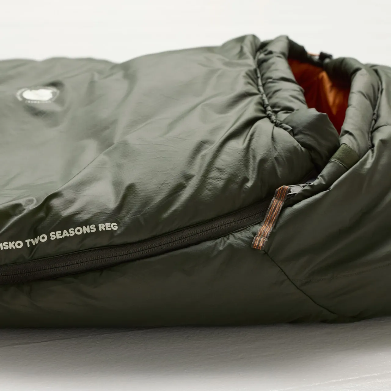 Reliable two-season sleeping bag perfect for hiking and trekking adventures, made from recycled materials that are light on your back as well as your conscience. Abisko Two Season Regular, for users up to 185cm, has numerous handy technical features, including an adjustable hood, internal zippered pocket, a full-length two-way zipper with anti-snag slider and angled footbox, plus a draft collar and draft tube to stop warm air escaping. The synthetic PrimaLoft® padding is especially developed for sleeping bags and will keep you warm even in damp conditions, and is also durable and easy to care for.