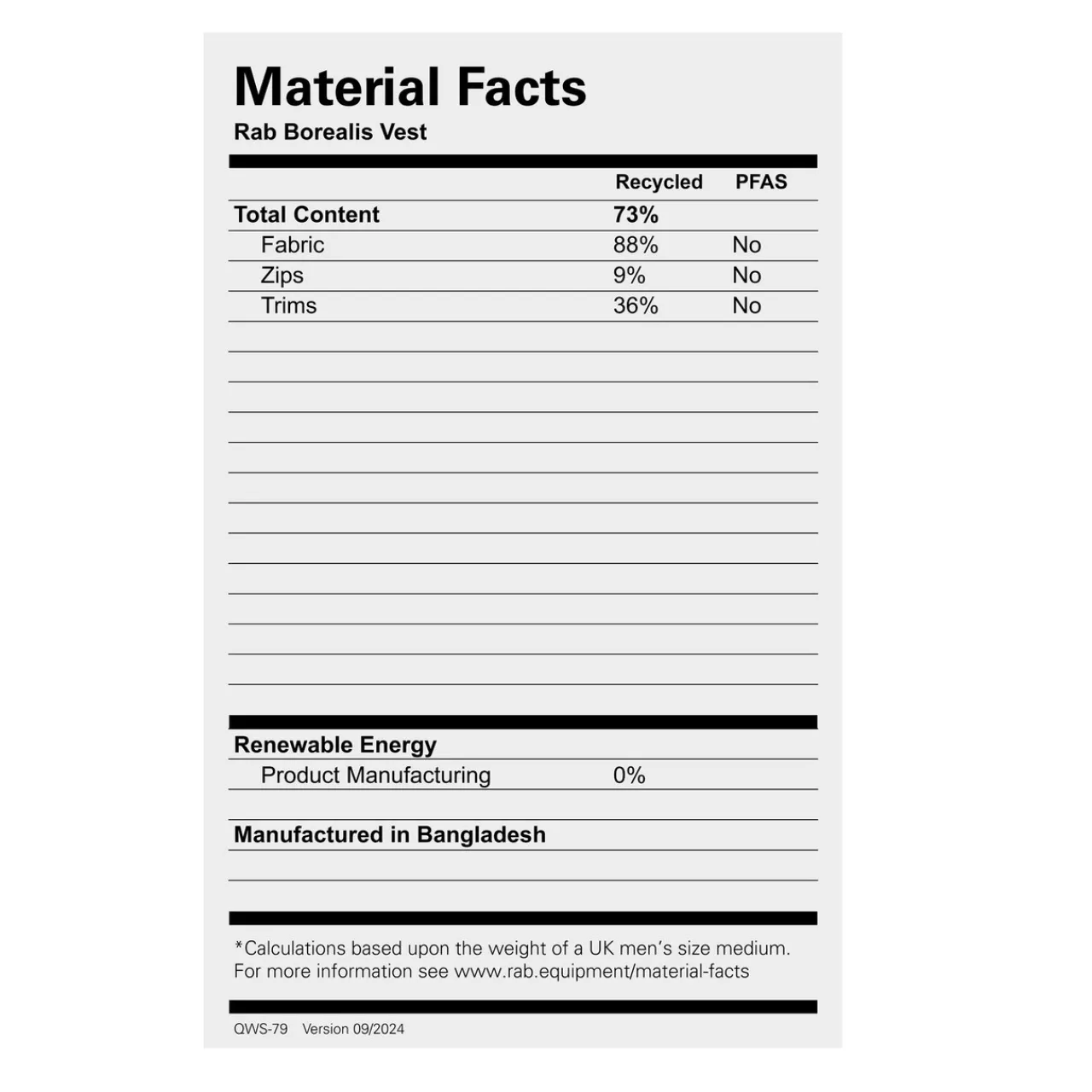 The Rab Borealis Vest weighs 168g in Medium and uses Rab’s Matrix fabric, offering enough wind protection without sacrificing airflow. It’s ideal for fast-paced walking, cool starts or breezy summits where a full jacket would be too much. The stretch is excellent, and the slim fit stays put without riding up or feeling restrictive under a pack.