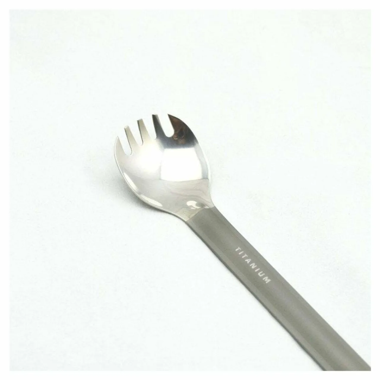 Lightweight titanium long handle spork with polished bowl and matte finish handle.