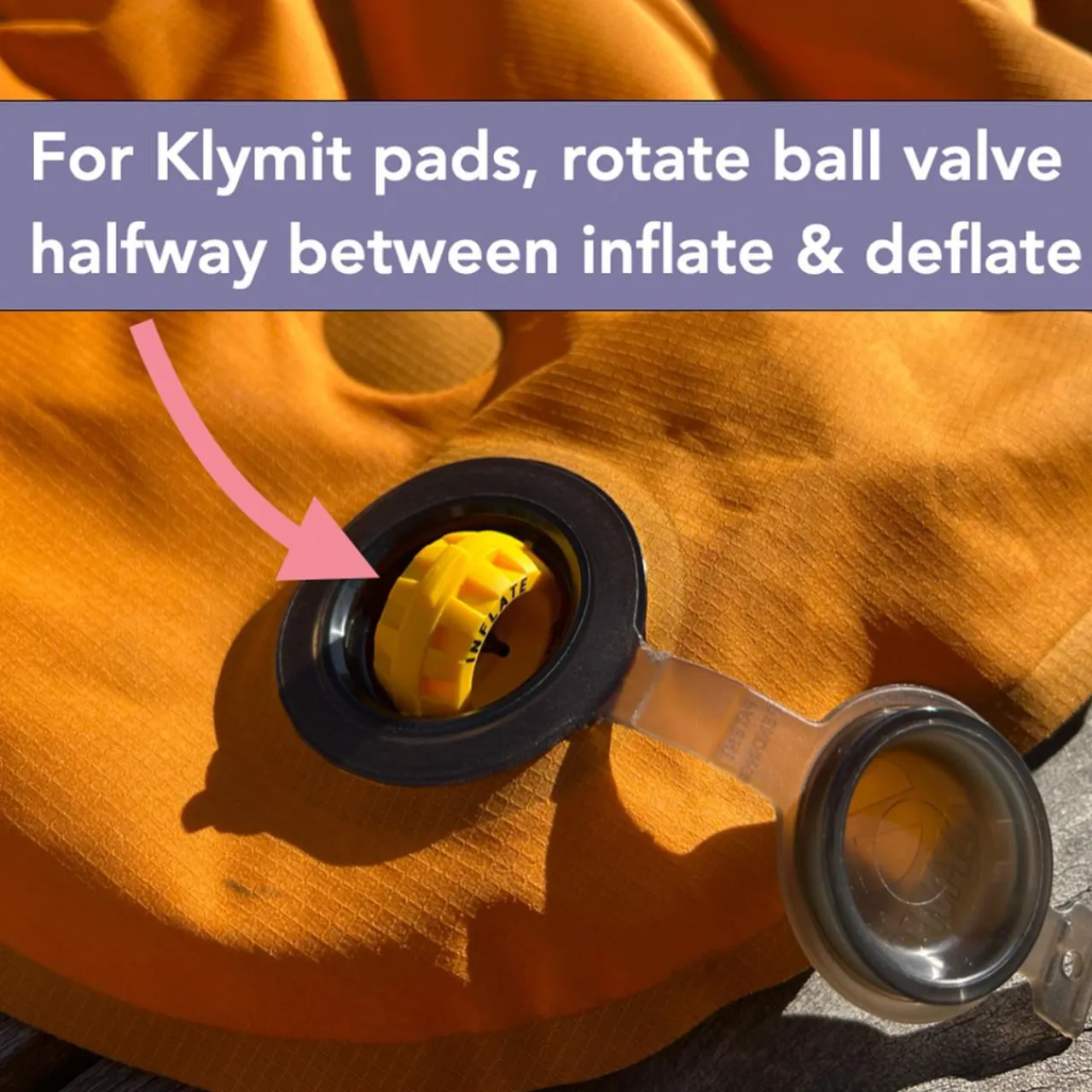 Note: For Klymit pads, the Alpenblow works best if the ball is turned halfway between inflate & deflate. Once you’re done inflating, rotate the valve shut from the back of the pad and remove the Alpenblow!