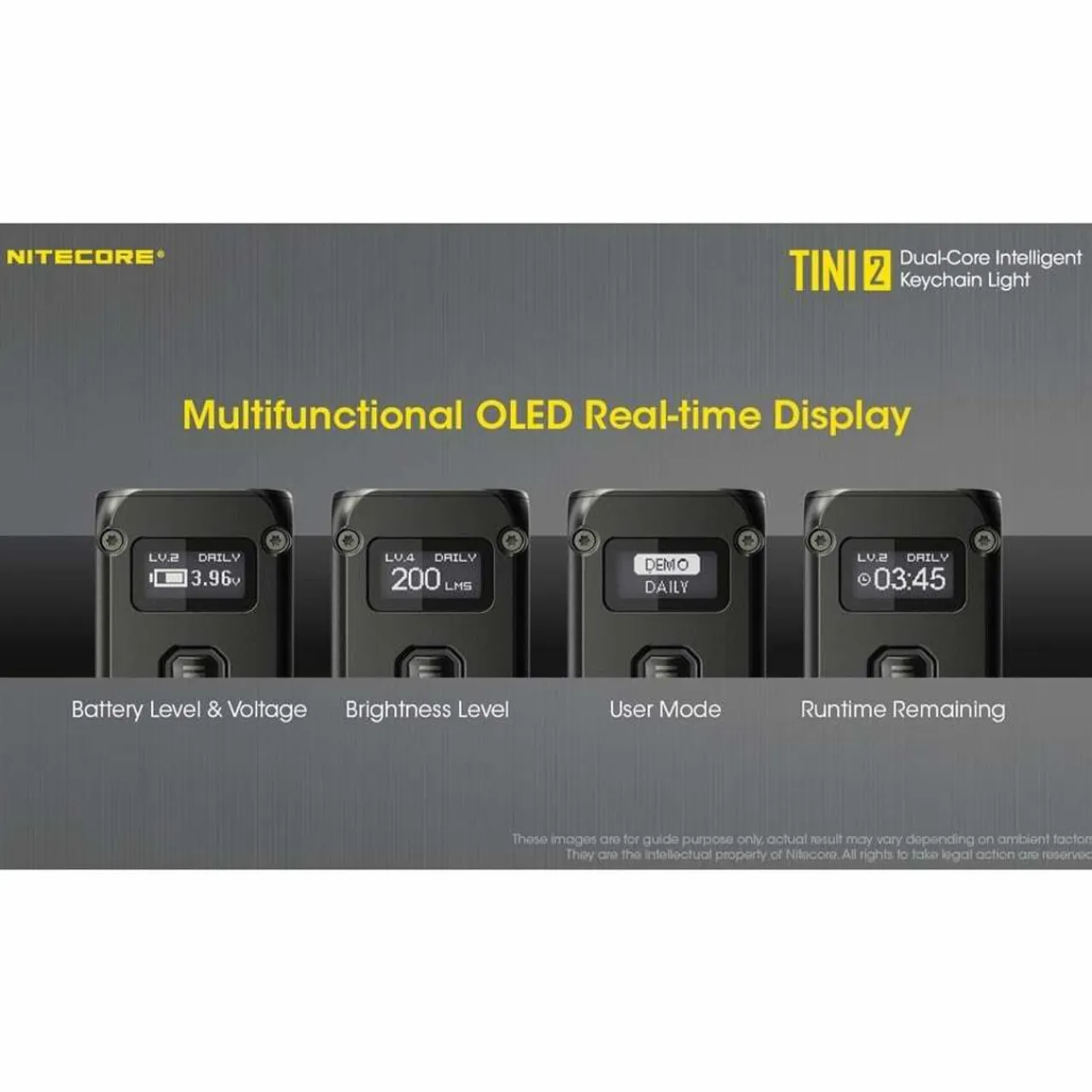 The TINI 2 features a multi-functional OLED display screen which provides real-time information on the battery voltage, brightness level, user mode and remaining runtime.