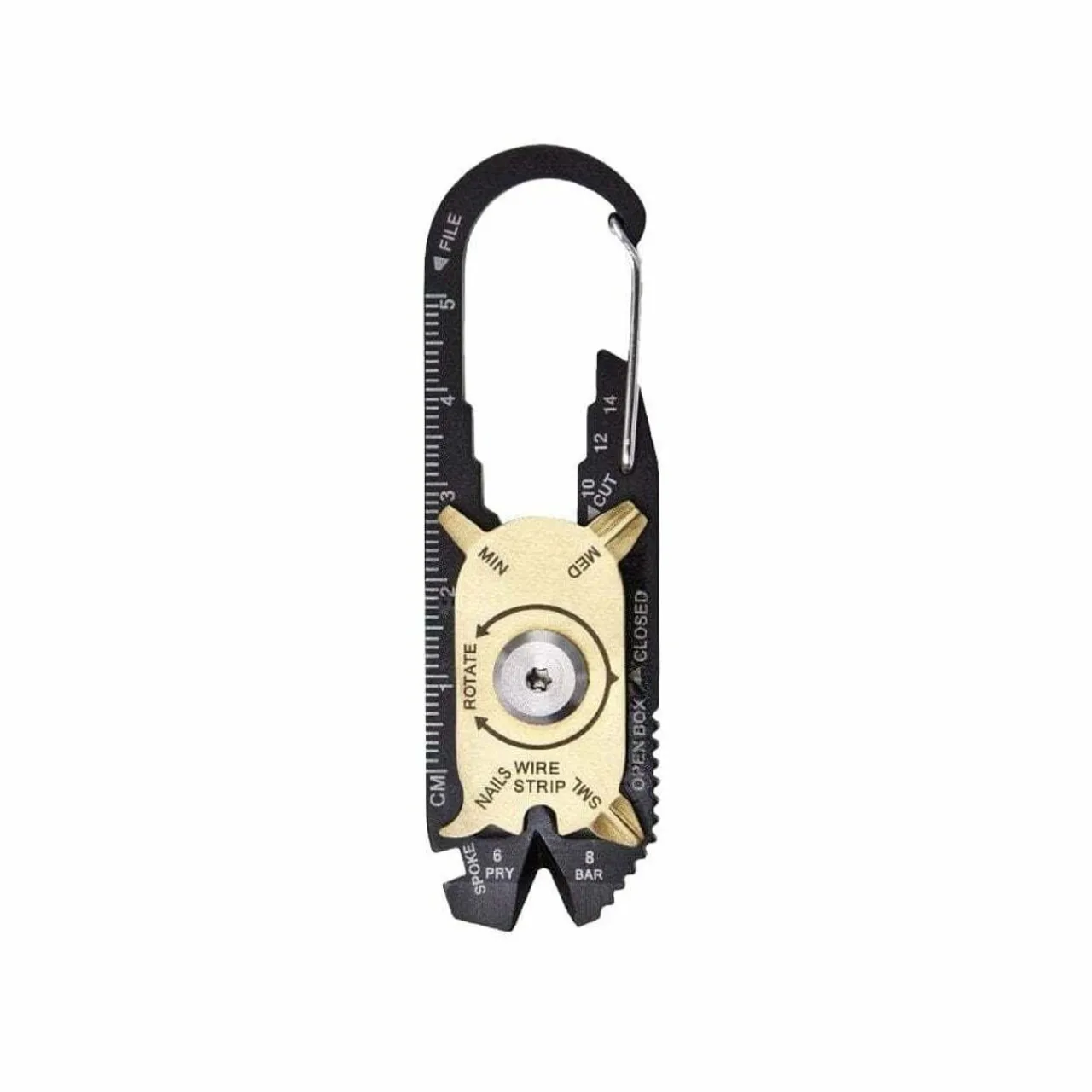 Fabricated in black titanium coated stainless steel, with a gold titanium coated rotating tool disc. The FIXR provides you with a remarkable array of essential tools; including screwdrivers and wrenches, a pry bar, file, bottle opener, and even a hidden cutter and wire stripper. The ideal ’flight-safe’ daily carry travel companion.