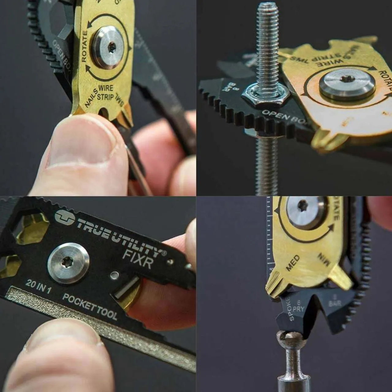 This patented carabiner tool simply attaches to your keychain or bag. The FIXR cleverly conceals within its real leather pouch 20 essential tools.