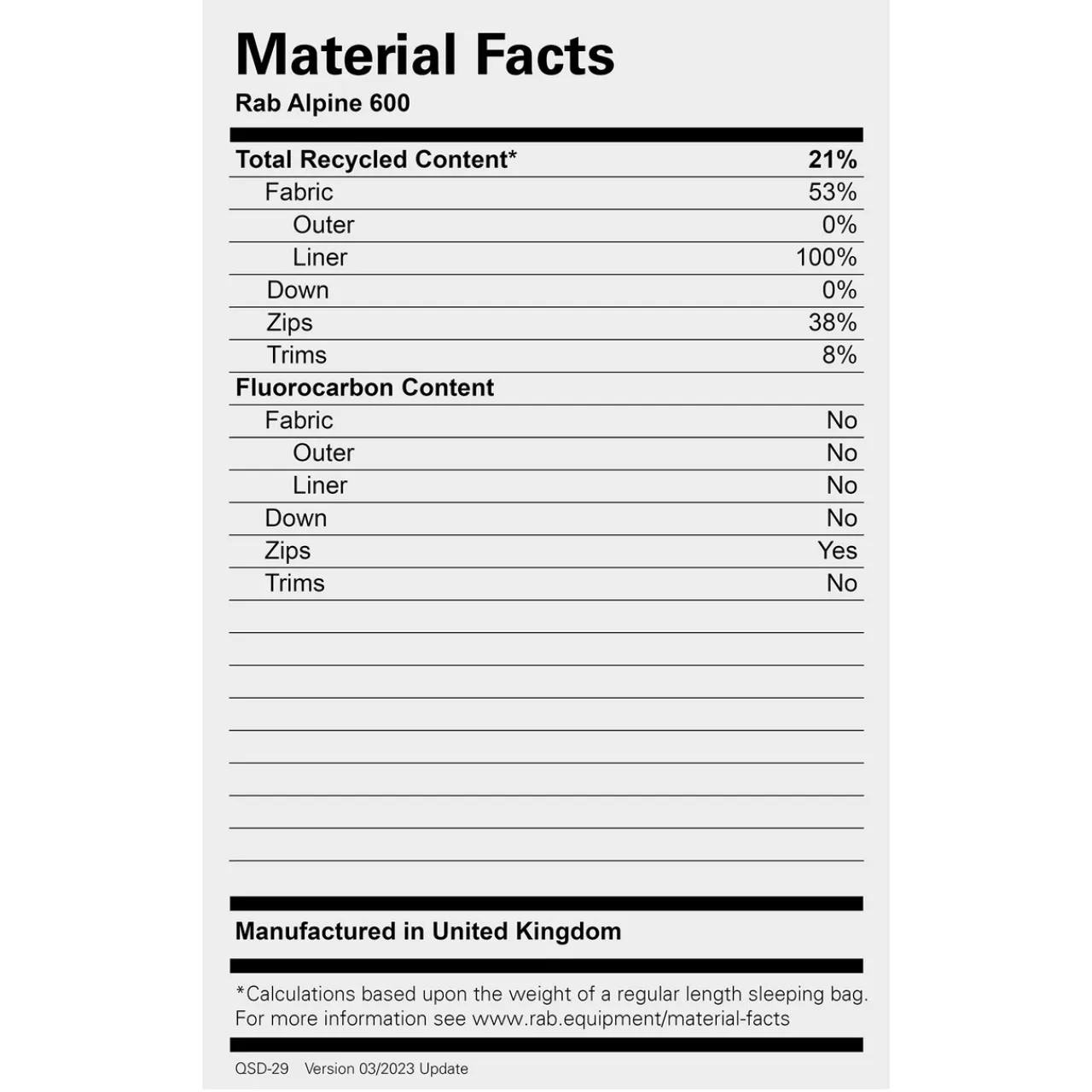 Rab’s Alpine 600 Down Sleeping Bag fits in the Alpine series which are filled with 650 Fill Power down contained in a trapezoidal boxwall baffle construction with a differential cut to eliminate cold spots. The slightly lower down quality compared to their premium bags makes these bags more affordable but they are still a technical bag.