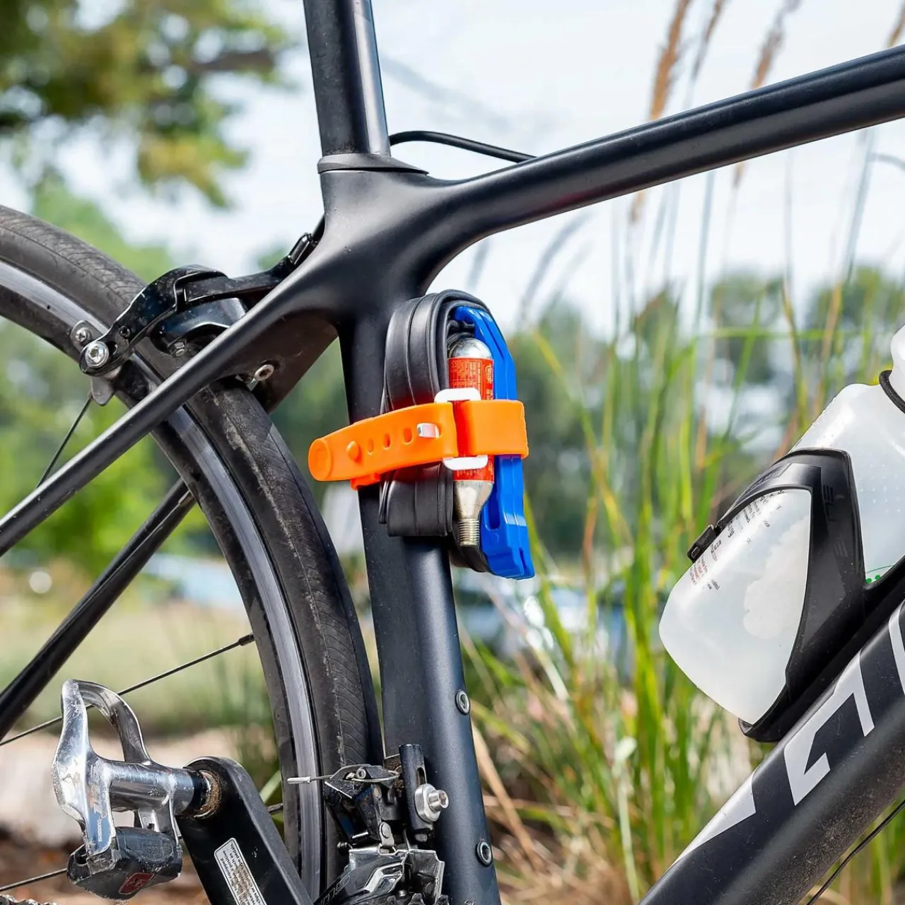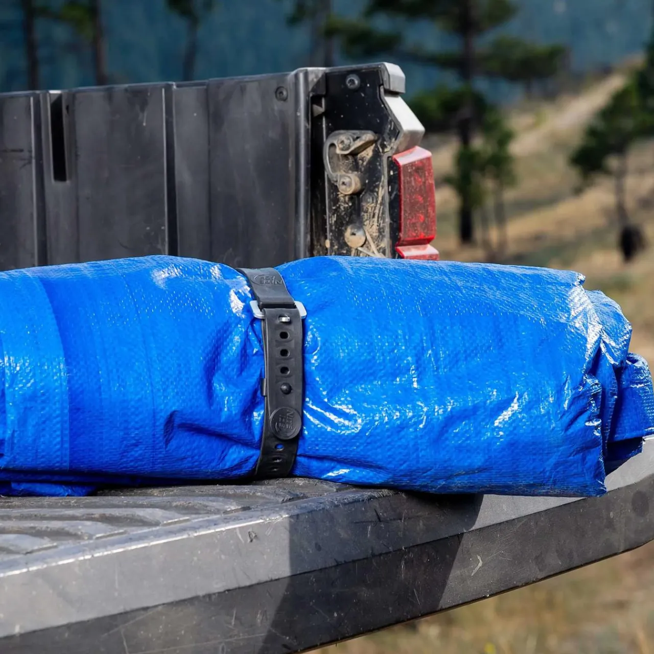 With the buckle post facing upwards, simply loop the strap around your gear of choice and pull the strap to create a tight cinch around your item, threading the aluminum post through one of the designated holes on the strap. Slide the Strap Cap into position and push the strap hole onto the snap, securing any excess strap end in place for a tidy connection.