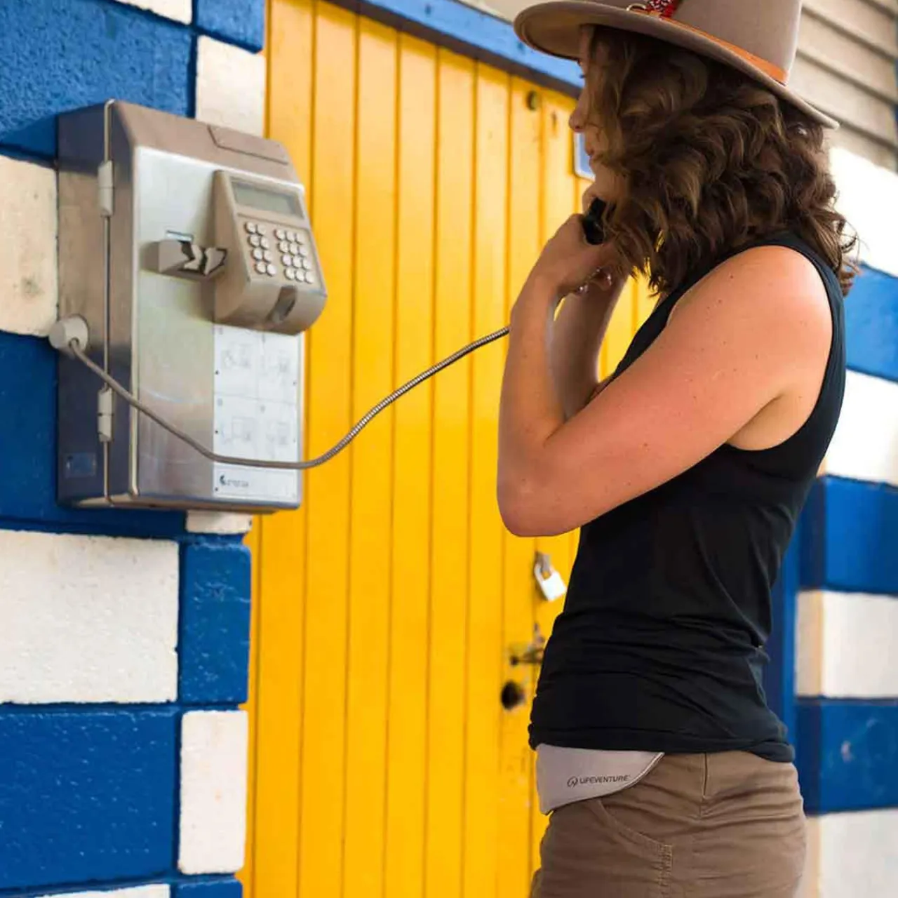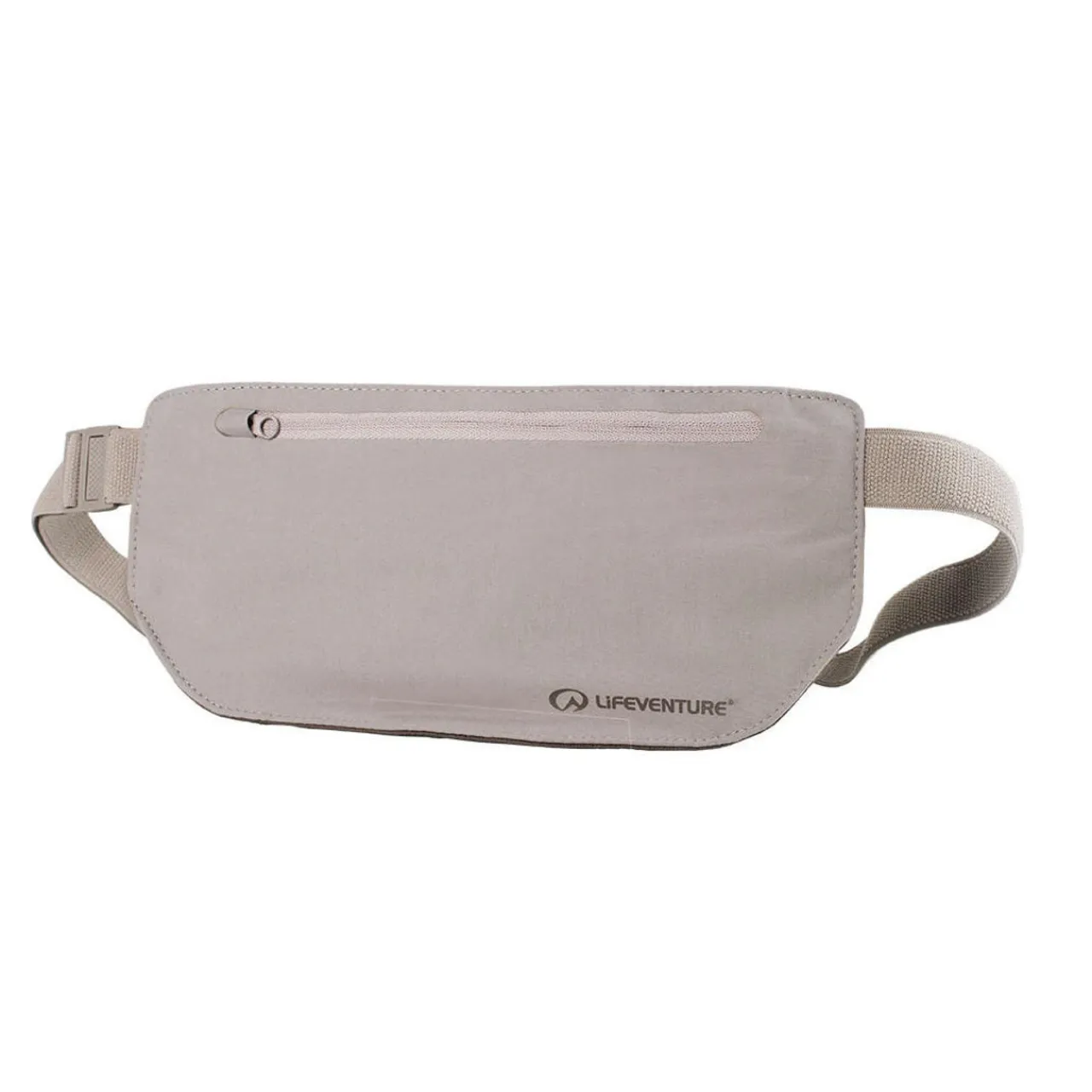 The Lifeventure RFID Mini Body Wallet securely carries valuables under clothing. It blocks RFID scanning and holds a passport, cash, and smartphone. The elasticated waist strap fits most travele