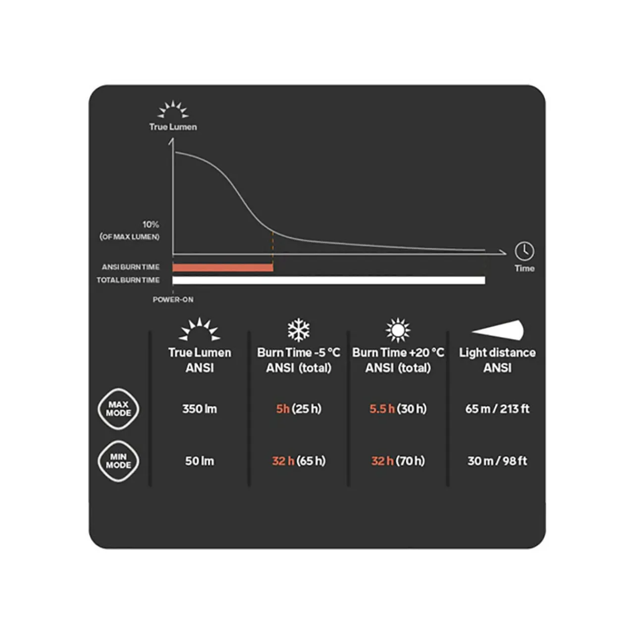 - Max Mode: 350 lumens / 65 metres, 213 ft / 5 hours (-5C), 5.5 hours (+20C) Burn time