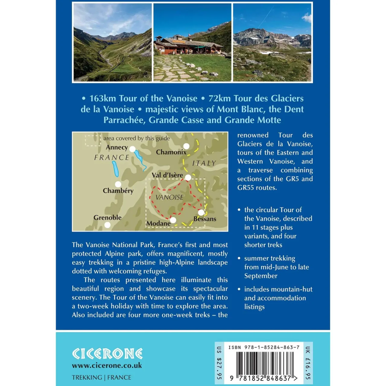 This guide describes the eleven-day 163km Tour of the Vanoise and the five-day 72km Tour des Glaciers de la Vanoise, two fantastic hut-to-hut treks through the pristine Alpine landscapes of France’s Vanoise National Park. Three other short treks – the Tour of the Eastern Vanoise, the Tour of the Western Vanoise and a Traverse of the Vanoise via the GR5 and GR55 – are also summarised. The routes tackle several passes in excess of 2500m but there are no glacier crossings, no significant scrambling and no lengthy paths exposed to either stonefall or vertigo-inspiring exposure (though optional variants may involve some slightly more challenging sections), and waymarking is usually clear – making this an ideal route for those new to Alpine trekking.