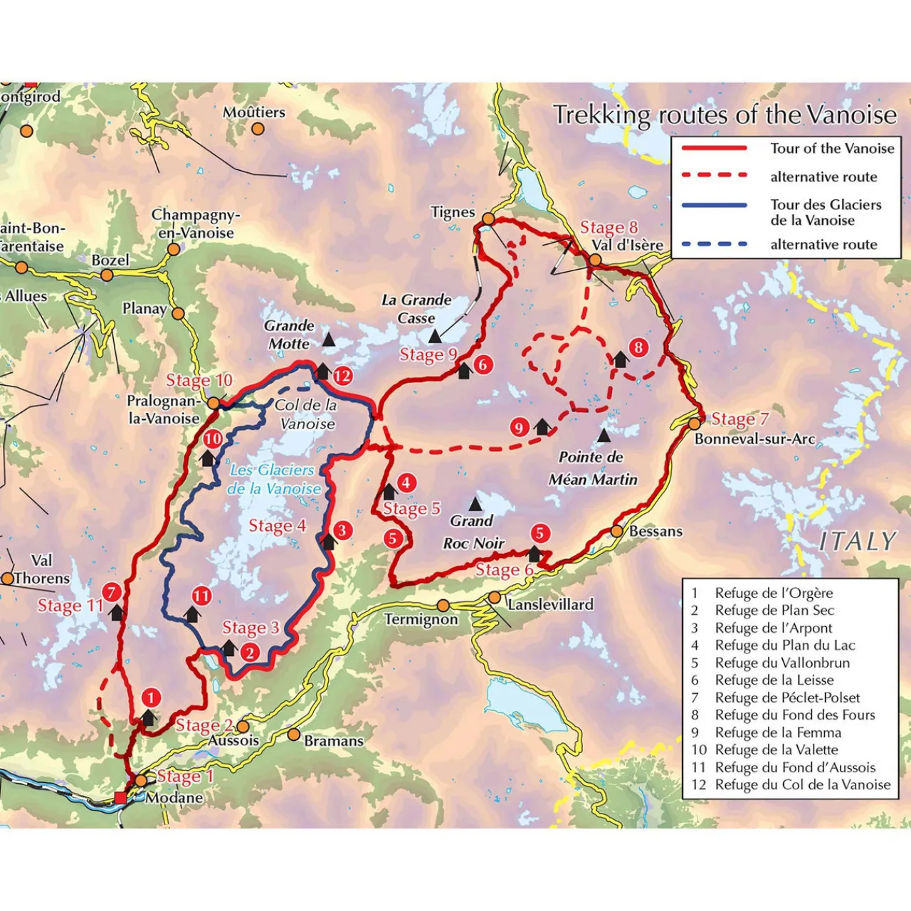- Centres: Modane, Termignon, Bonneval-sur-Arc, Val d’Isère, Tignes, Pralognan-la-Vanoise