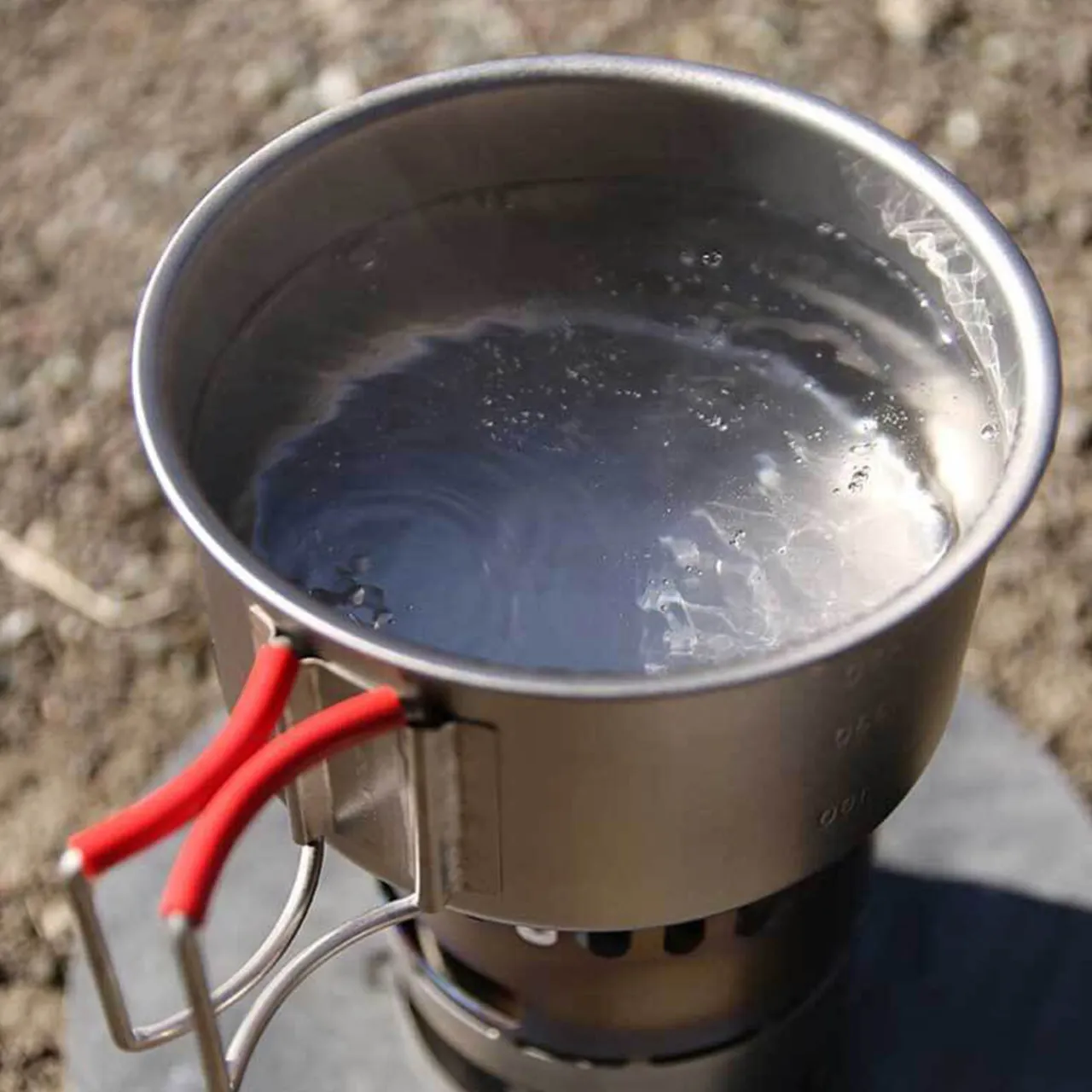 Lightweight titanium cup with foldable handles. Gradations are stamped for easy measurement. Large surface area improves heating efficiency.
