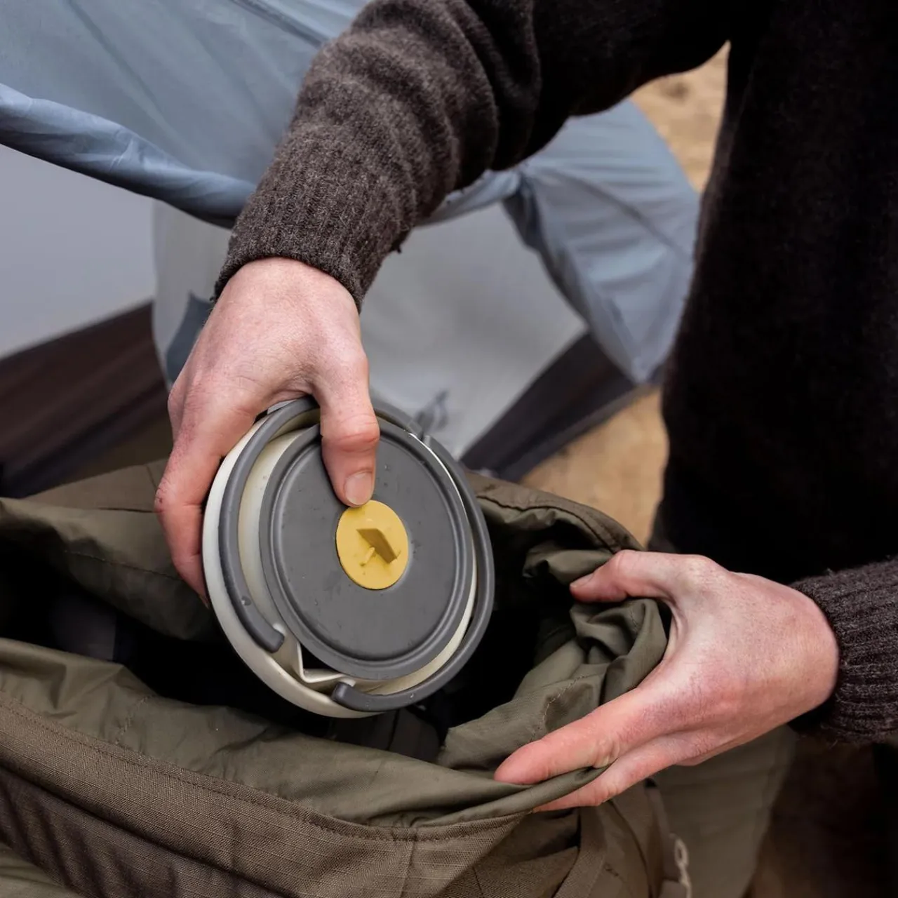 The bowl and cup are made from glass-reinforced polypropylene, which gives them the rigidity many collapsible pieces lack — they stay upright and firm when full, without squashing in on your hands. Everything nests smoothly, making this a tidy little system for fast-and-light camp meals.