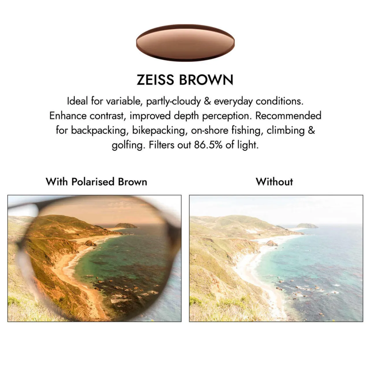 - Zeiss Brown: Ideal for variable, partly-cloudy & everyday conditions. Enhanced contrast, improved depth perception. Recommended for backpacking, bikepacking, on-shore fishing, climbing & golfing. Filters out 86.5% of light.