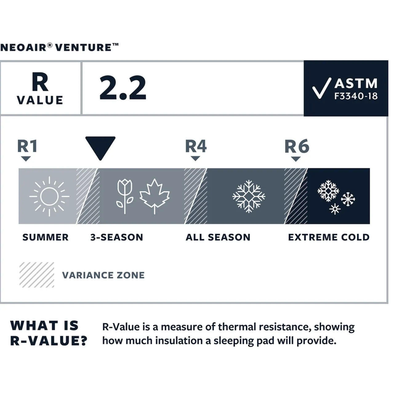 Designed for adventurous trips and explorers, the Venture sleeping pad delivers legendary NeoAir comfort to any camp. Built with our WaveCore construction, the 2.2 R-value pad creates cells of air that retain warmth and shield from the cold. The two-inch (5cm) pad uses tough 50D polyester face is backcountry ready, giving you confidence during camping and backpacking adventures. The easy-to-pack Venture features the high-performance WingLock valve, allowing the pad to inflate three times faster thanks to a larger opening and one-way inflation. Like all Therm-a-Rest pads, the NeoAir Venture is made in market to ensure quality and minimize environmental impact. The pad includes a breath-saving pump sack, compact stuff sack and field repair kit.
