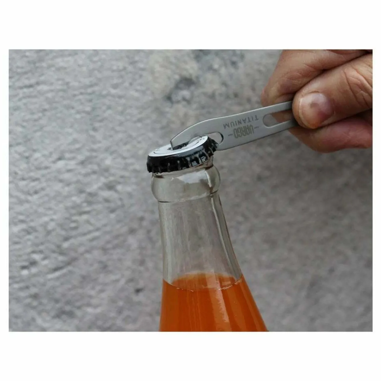 A Lightweight, titanium utensil that combines fork, spoon and a bottle and tin opener.