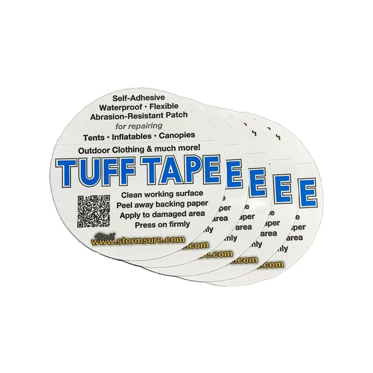 - Contents: 5 x Stormsure TUFF Tape Adhesive Patches (circular – 75mm diameter).