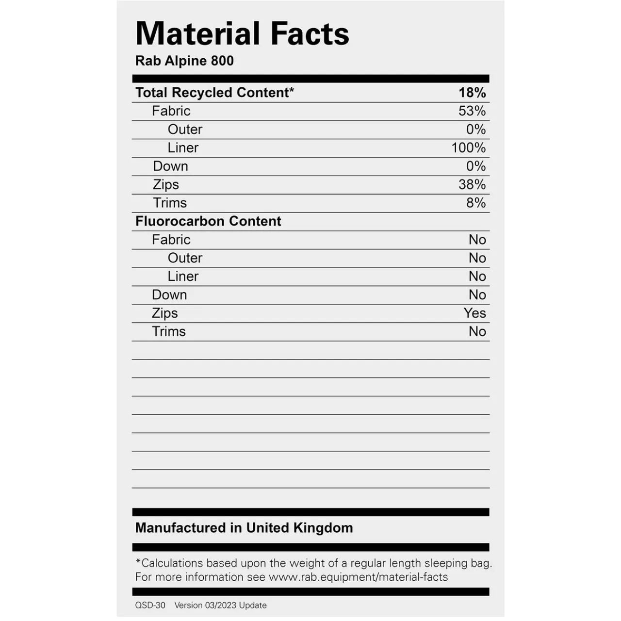 Rab’s Alpine range uses 650 Fill Power down contained in technical baffles in a bag with a slim fitting Tapered Mummy shape to create sleeping bags with very good warmth to weight ratios suitable for backpackers and trekkers.