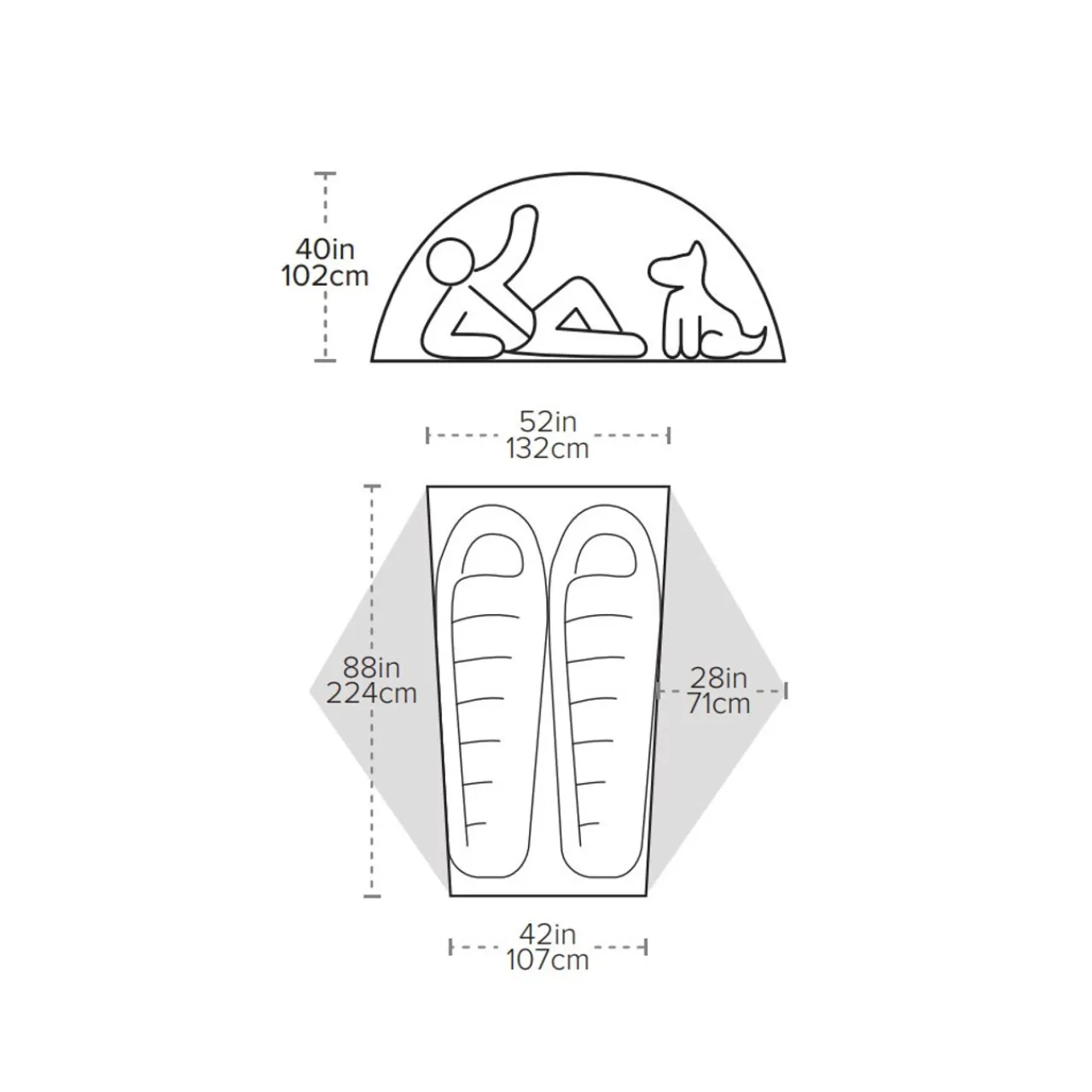 - Dome tent for 2 people (130 cm inner tent width)