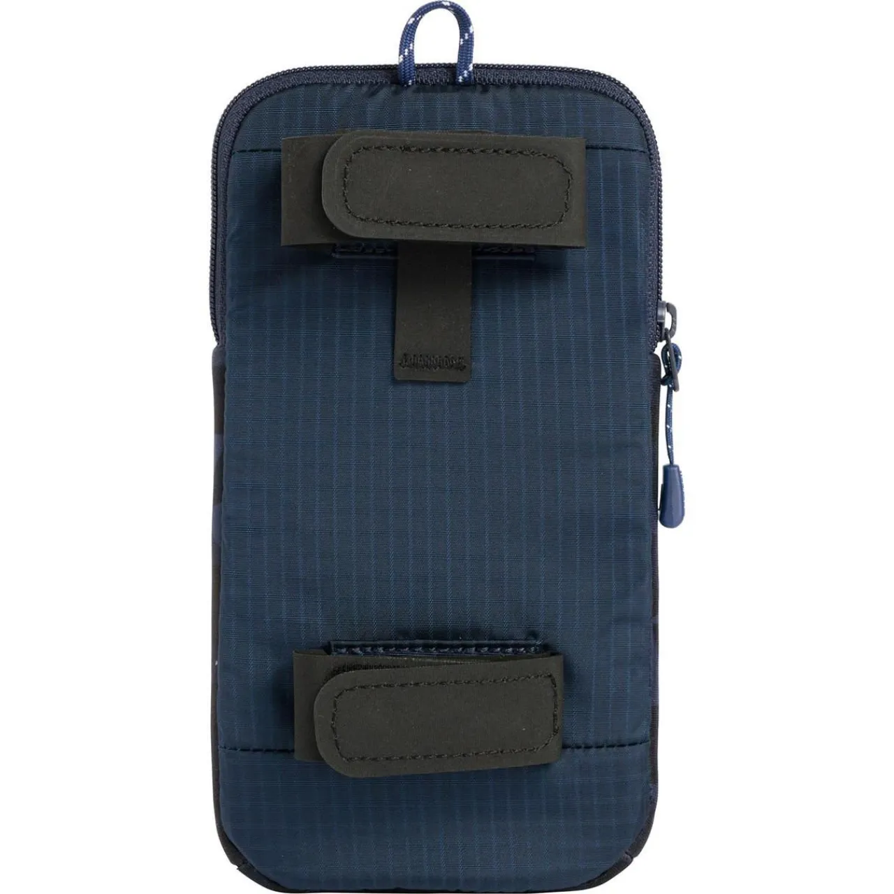 Attaches to the shoulder strap of a backpack while holding a smartphone. Two rear hook-and-loop straps keep the pouch in place during active movements and detach for compatibility with belts, backpack hipbelts, hooks, and other objects. The main body is constructed with stretchy, cushioned material.