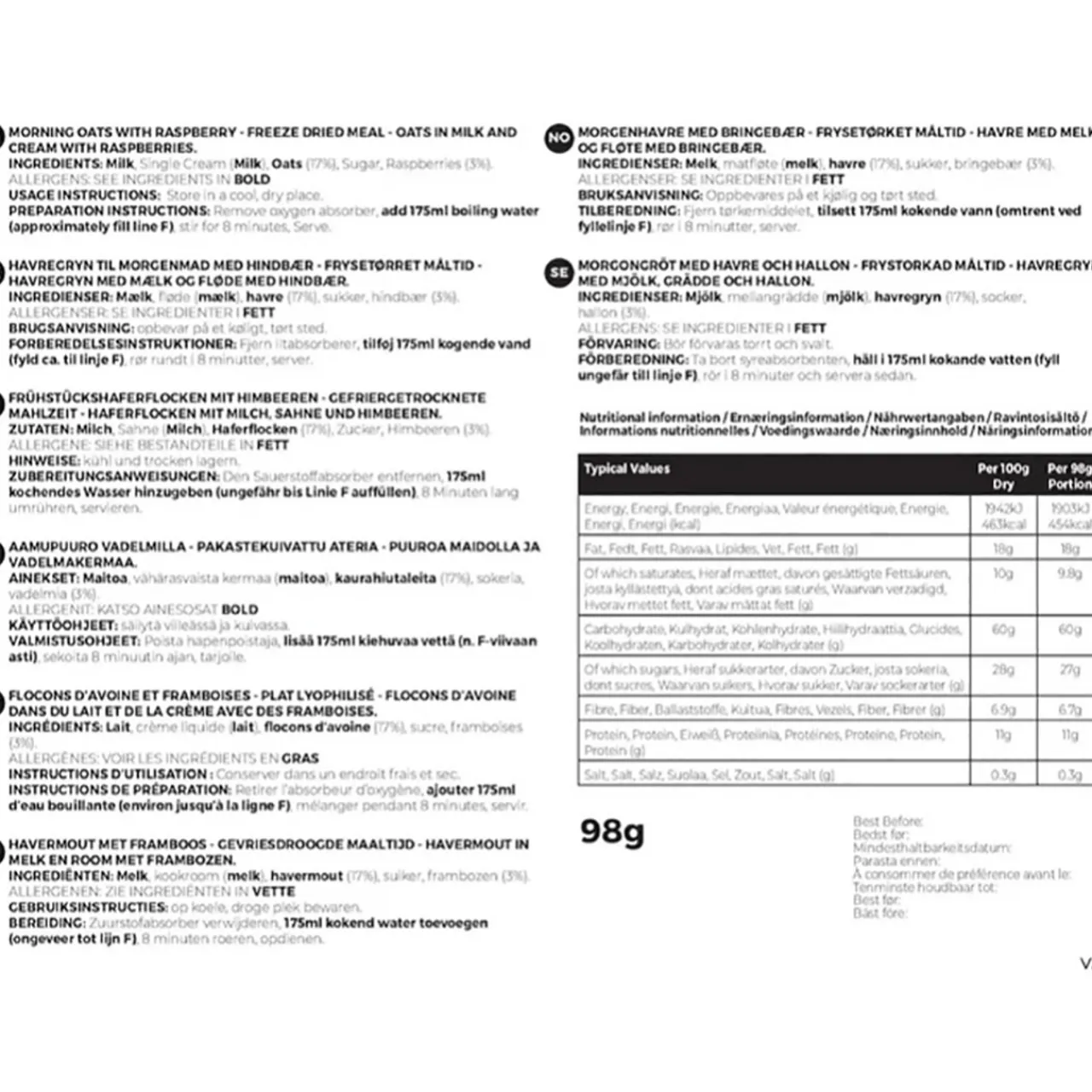 Preparation: Add up to 255ml hot water, stirring as you pour and then close the bag. Wait approximately 4 minutes for the food to rehydrate and enjoy. *Remove the Oxygen Absorber Sachet from inside the pouch first.