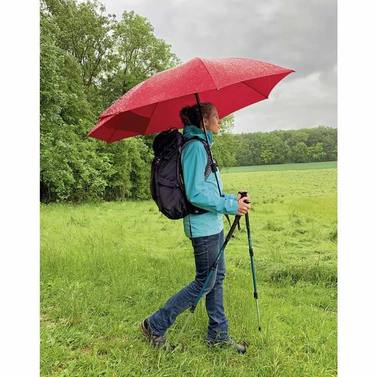 The added bonus of the this umbrella is the extended canopy at the rear of the umbrella which also protects your backpack from the rain. You no no longer need to faff about with rucksack covers when heavens open. Thanks to the soft ergonomic handle the canopy always covers the rear.