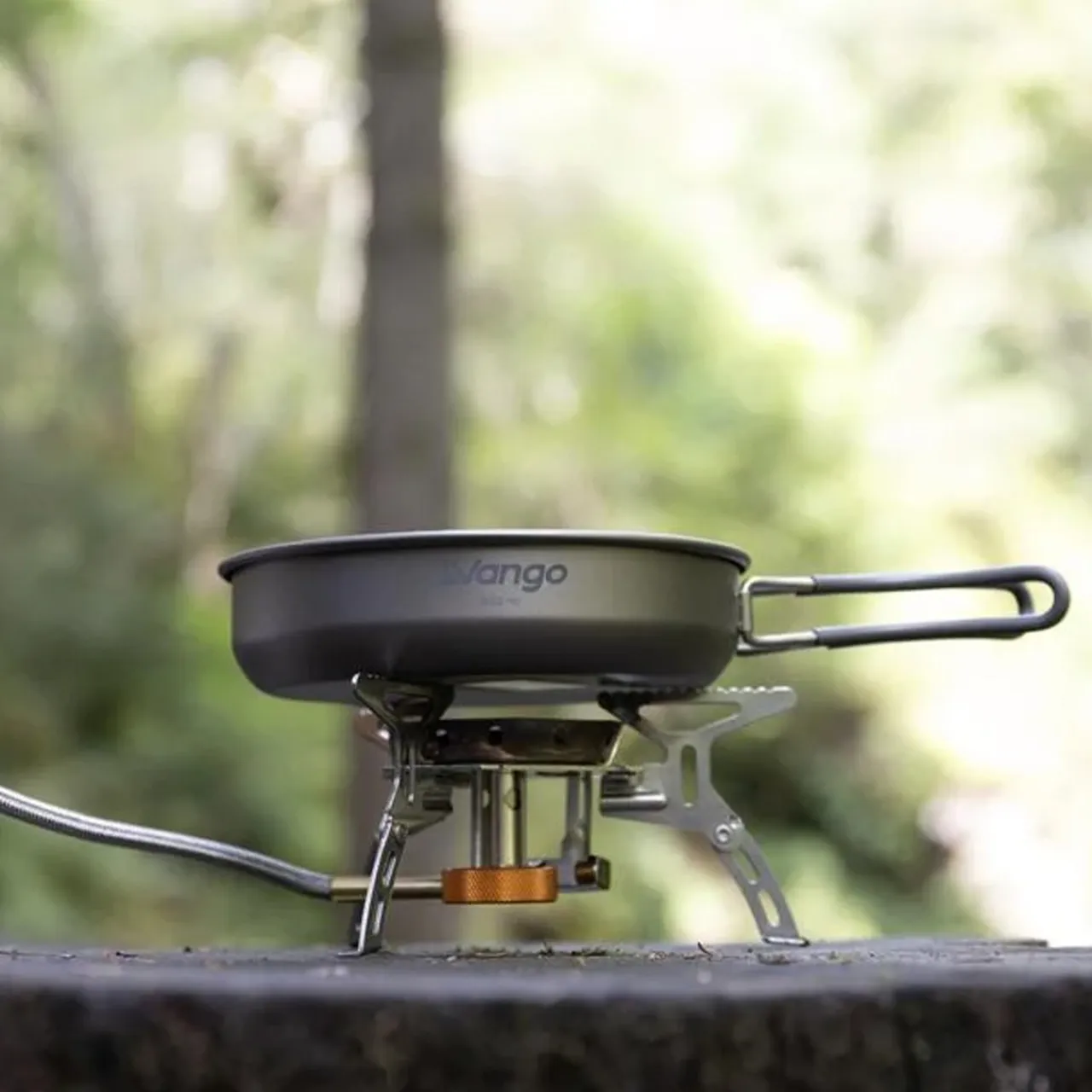 The Vango Titanium 2 Piece Cook Set offers a no-nonsense setup for ultralight hikers who still want a proper cook system. At just 178g total, it includes a 680ml pot and a 500ml frying pan made from titanium with fold-away, silicone-coated handles. Heat transfer is quick — ideal for boiling water or knocking up a simple pasta — though like most titanium sets, it can be a little fierce if you’re trying to simmer.