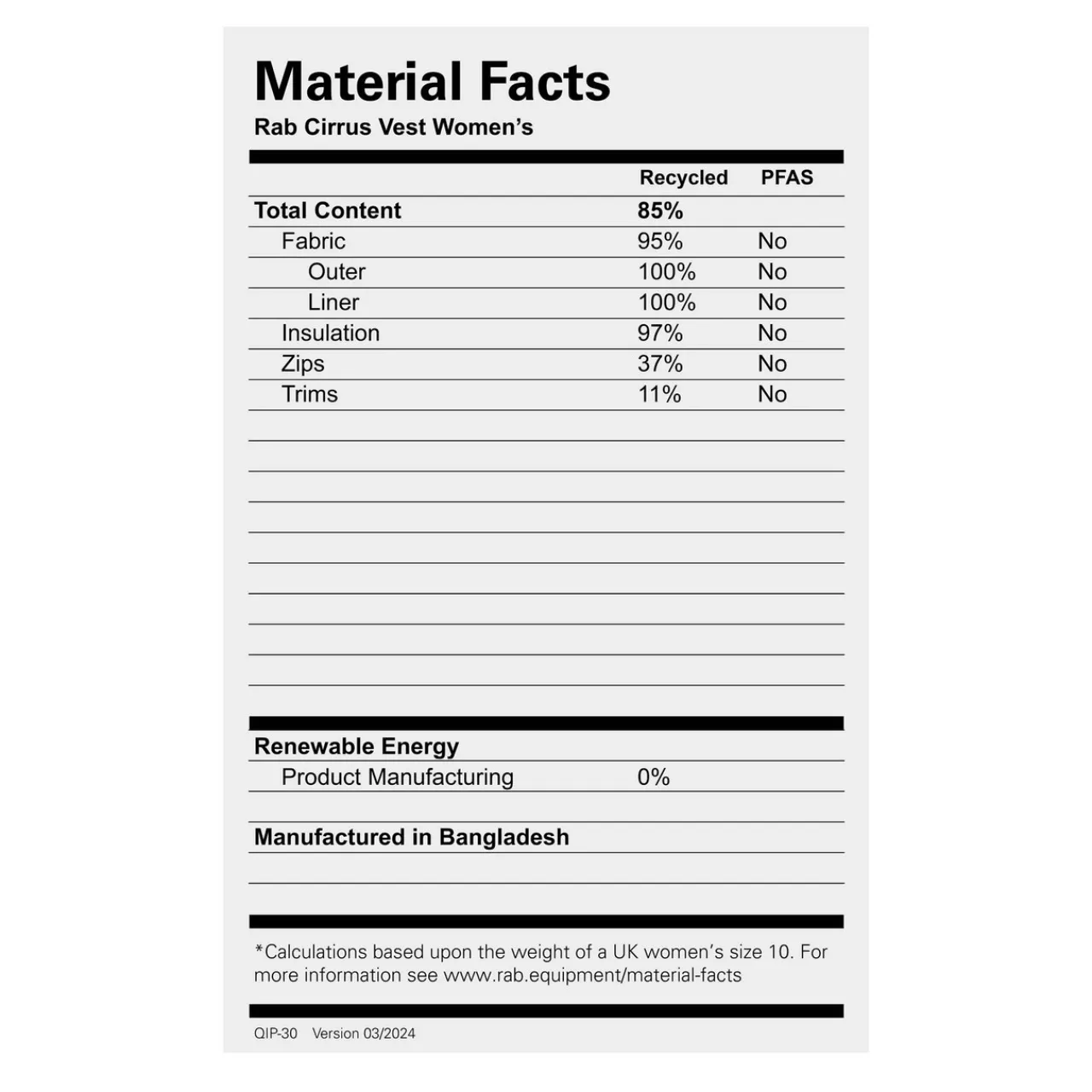 The vest’s Pertex® Quantum outer and lining, made from recycled materials, offer impressive durability while remaining environmentally conscious. The DWR finish helps repel light moisture, making it suitable for unpredictable mountain weather. Weighing just 280 grams (UK12), the Cirrus Insulated Vest is lightweight yet practical, easily packed into its integrated storage pocket, including a handy clip-in loop for secure stowing.